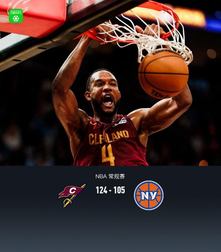 第四节骑士艾伦拿下7分,尼克斯唐斯拿下10分,最终骑士124-105战胜尼克斯