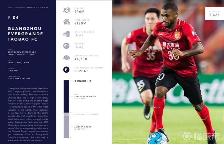 广州恒大淘宝足球俱乐部是整个榜单中排名最高的非欧洲球队。球员总身价为4600万欧元,排名中超第2,世界第68。恒大能有如此高的排名,是因为球队老板巨大的未来投资潜力。