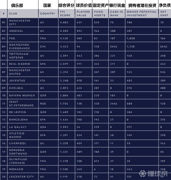 这个排名综合了从15-16赛季开始的5个因素,分别是球员价值、固定资产价值、银行存款、球队拥有者投资潜力和球队负债。为统一标准,本文所用货币单位均为欧元。