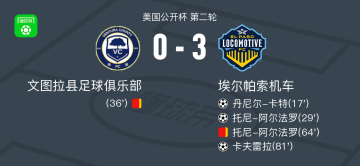 北京时间4月3日美国公开杯 第二轮,文图拉县足球俱乐部对阵埃尔帕索机车。埃尔帕索机车丹尼尔-卡特破门,托尼-阿尔法罗破门,卡夫雷拉破门。最终比分文图拉县足球俱乐部 0-3 埃尔帕索机车。