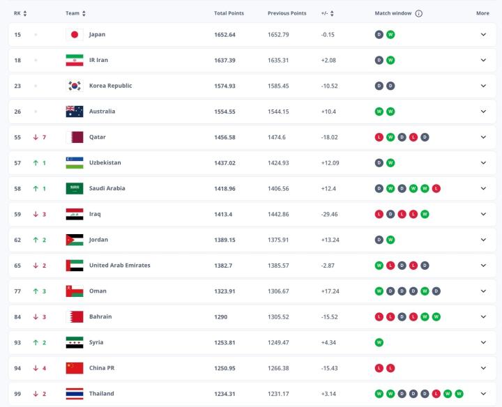 在本次排名中,卡塔尔的排名下降了7位,位列世界第55位;沙特阿拉伯队和乌兹别克斯坦队都上升1位,分别位列57位和58位。国足的小组对手巴林队下降3位,位列84名。