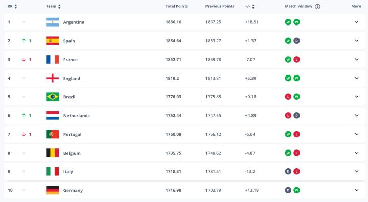 在本次更新的FIFA排名中,阿根廷仍保持世界第一,而西班牙则反超了法国,位列次席;荷兰也超过葡萄牙升至第6名。