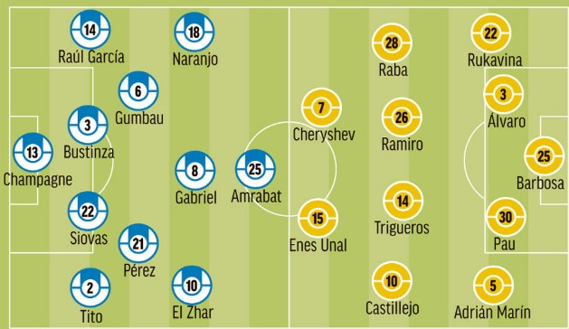比利亚雷亚尔(442):巴尔博萨;阿德里安-马林、P-托雷斯、阿尔瓦罗-冈萨雷斯、鲁卡维纳;卡斯蒂列霍、特里格罗斯、拉米罗-格拉、拉瓦;切里舍夫、于纳尔