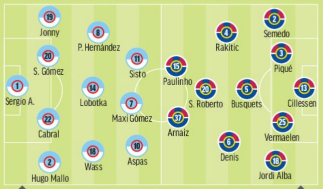塞尔塔(433):塞尔希奥-阿尔瓦雷斯;容尼-卡斯特罗、塞尔希-戈麦斯、卡夫拉尔、马略;巴勃罗-埃尔南德斯、罗伯特卡、丹尼尔-沃斯;西斯托、马克西-戈麦斯、阿斯帕斯