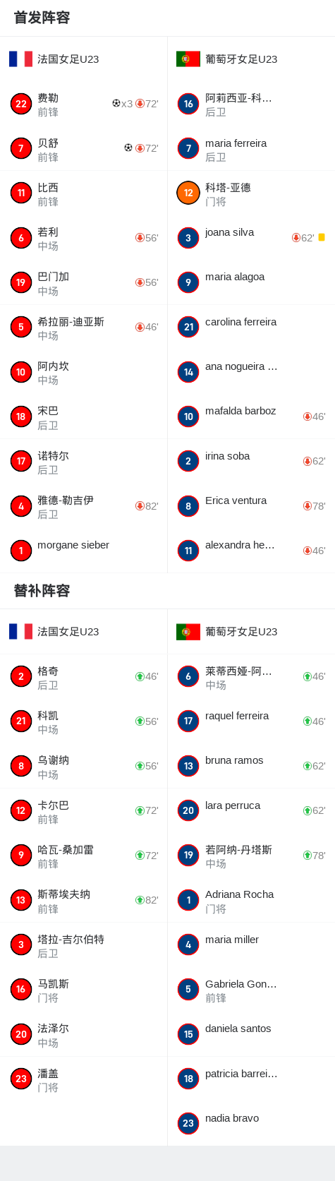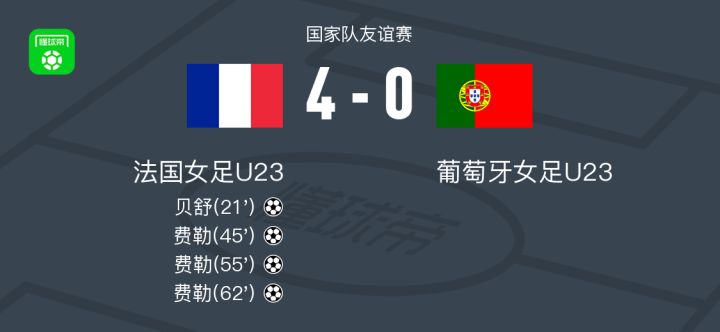 北京时间4月3日国家队友谊赛,法国女足U23对阵葡萄牙女足U23。法国女足U23贝舒破门,费勒帽子戏法。最终比分法国女足U23 4-0 葡萄牙女足U23。