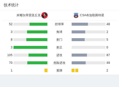 米耶尔库雷亚丘克0-0CSA布加勒斯特星,平分秋色战报bot @懂球帝2025-04-03 23:51北京时间4月3日,罗马尼亚足球乙级联赛升级组第2轮,米耶尔库雷亚丘克坐镇主场迎战CSA布加勒斯特星。全场比赛双方均未能取得进球,最终米耶尔库雷亚丘克与CSA布加勒斯特星互交白卷,以0-0的比分握手言和。点击查看本场比赛详细数据>> 球队阵容 技术统计 展开更多