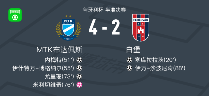 匈牙利杯半准决赛中,MTK布达佩斯与白堡展开较量。比赛中,塞库拉拉茨为白堡率先建功,但MTK布达佩斯迅速掌控局面,内梅特、伊什特万-博格纳尔和尤里瑙接连进球,帮助球队确立领先优势。随后,米利切维奇不慎自摆乌龙,进一步扩大了MTK布达佩斯的领先。尽管伊万-沙波尼奇为白堡再下一城,但未能改变比赛结果。最终,MTK布达佩斯以4-2战胜白堡,成功晋级下一轮。