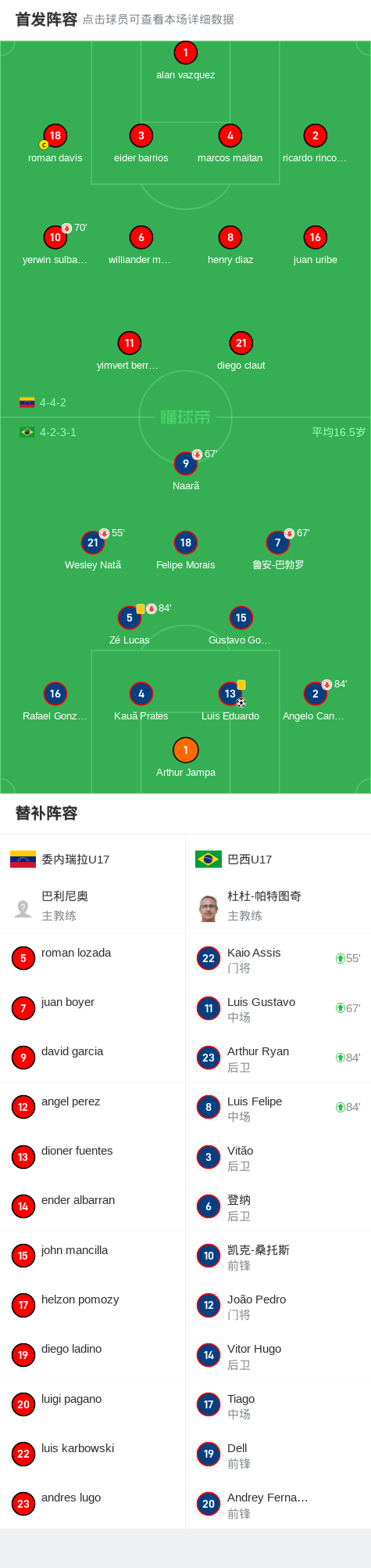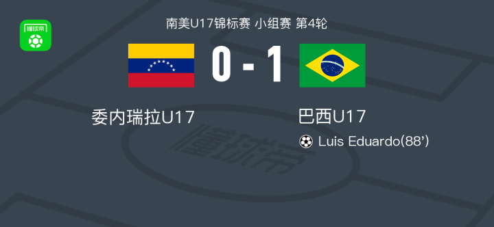 巴西U17 1-0委内瑞拉U17,Luis Eduardo绝杀战报bot @懂球帝2025-04-04 09:54南美U17锦标赛小组赛第4轮,委内瑞拉U17与巴西U17展开较量。比赛中,巴西U17凭借Luis Eduardo的进球打破僵局。最终,委内瑞拉U17以0-1的比分不敌巴西U17。点击查看本场比赛详细数据>>精彩瞬间第88分钟,巴西U17球员Luis Eduardo打入一球。 球队阵容 展开更多