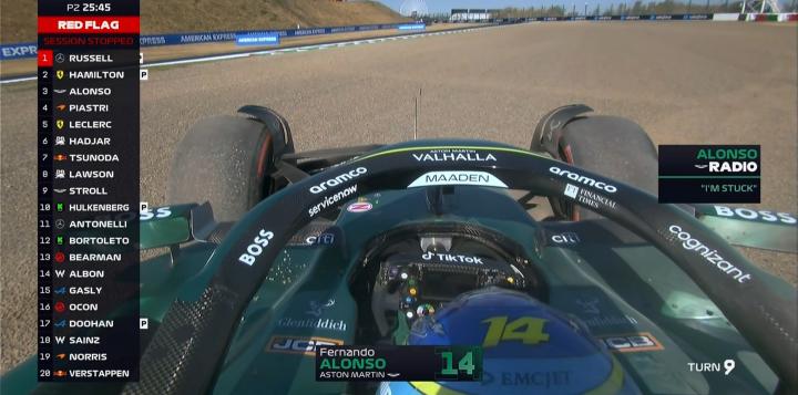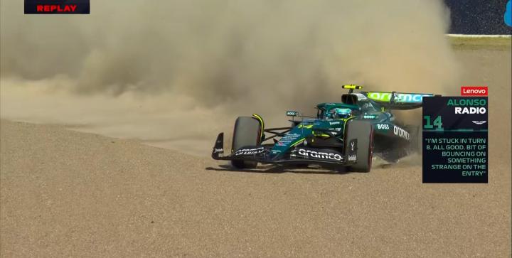 红旗×2!阿隆索的赛车失控陷入砂石地,好在赛车未受损!