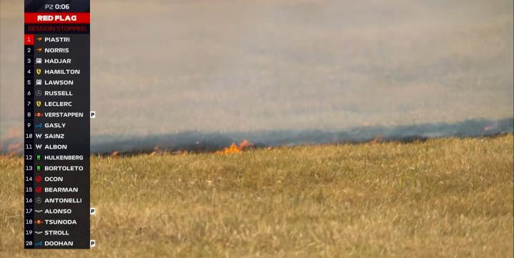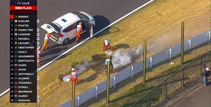 红旗×4!赛道再次出现草地起火的状况,17号弯的草地烧焦范围不小!
