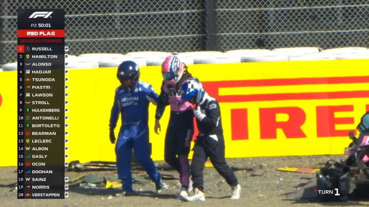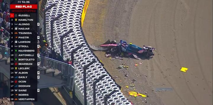 红旗!未参加一练的杰克-杜汉在1号弯高速失控上墙,赛车严重受损!