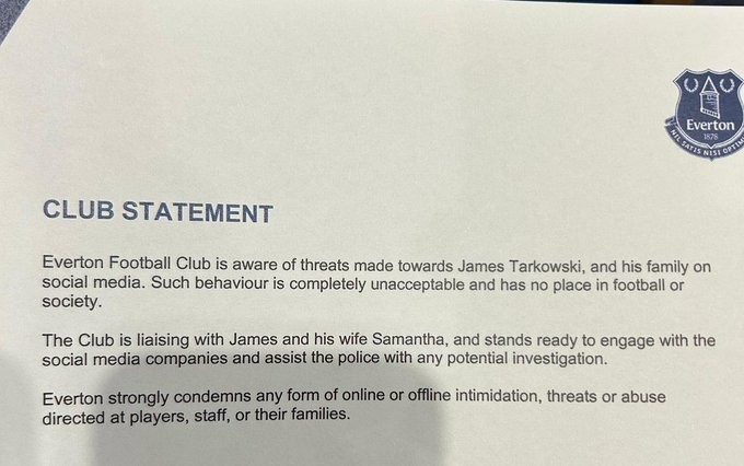 俱乐部正与球员及其妻子萨曼莎沟通,并准备与社交媒体公司合作,协助警方进行任何可能的调查,埃弗顿强烈谴责任何形式的线上或线下恐吓、威胁或针对球员、员工及其家属的辱骂行为。