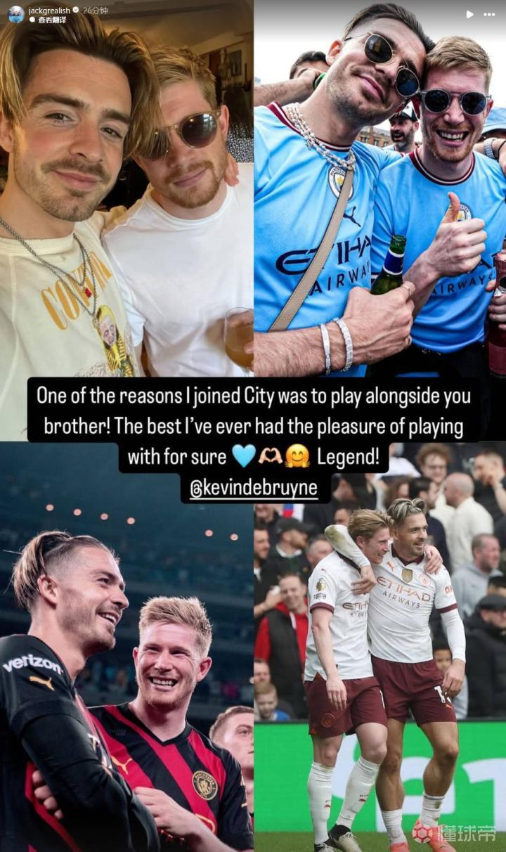 格拉利什晒出了自己与德布劳内的合照,并配文:“我加盟曼城的原因之一就是想和你一起踢球,兄弟!你是我合作过的最好的球员,很荣幸能和你一起踢球,传奇。”
