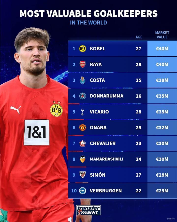 在完成最近一次身价更新后,德国转会市场网站列出了世界足坛门将身价榜,科贝尔、戴维-拉亚4000万欧最多。