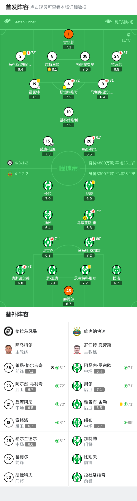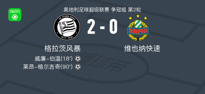 奥地利足球超级联赛争冠组第二轮,格拉茨风暴坐镇主场迎战维也纳快速。比赛中,威廉-伯温为格拉茨风暴首开纪录,随后莱昂-格尔吉奇再下一城锁定胜局。最终,格拉茨风暴以2-0战胜维也纳快速。