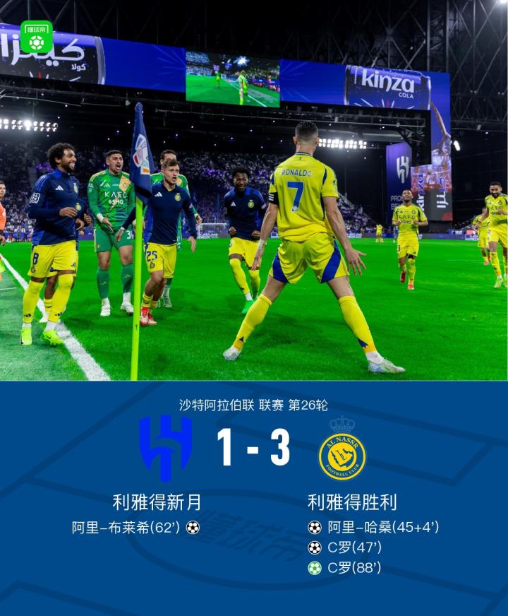 沙特阿拉伯联赛第26轮,利雅得新月主场迎战利雅得胜利。比赛中,利雅得胜利由阿里-哈桑率先建功,随后C罗扩大比分。利雅得新月方面,阿里-布莱希为球队扳回一城。比赛尾声阶段,C罗通过点球完成梅开二度。最终,利雅得新月1-3不敌利雅得胜利。