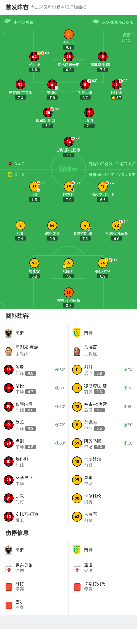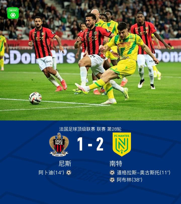 法国足球顶级联赛第28轮,尼斯主场迎战南特。比赛中,南特由道格拉斯-奥古斯托率先打破僵局,随后尼斯凭借阿卜迪的进球迅速扳平比分。之后,南特通过阿布林的进球再次取得领先。最终,尼斯1-2不敌南特。