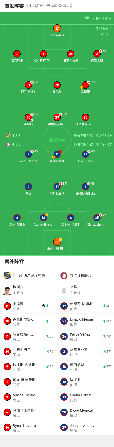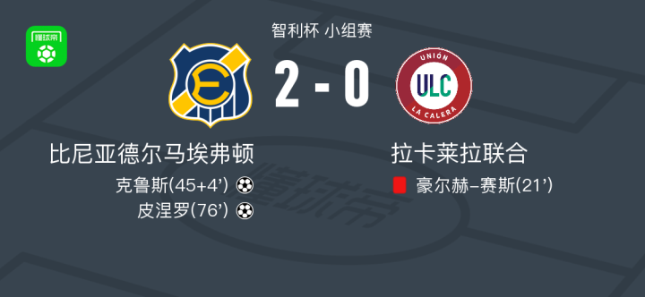在智利杯小组赛的一场较量中,比尼亚德尔马埃弗顿与拉卡莱拉联合展开角逐。比赛中,拉卡莱拉联合有一名队员因严重犯规被罚下场,导致球队陷入人数劣势。比尼亚德尔马埃弗顿抓住机会,由克鲁斯在上半场补时阶段打破僵局。随后,皮涅罗在比赛后半段再入一球,为球队锁定胜局。最终,比尼亚德尔马埃弗顿以2-0战胜拉卡莱拉联合。