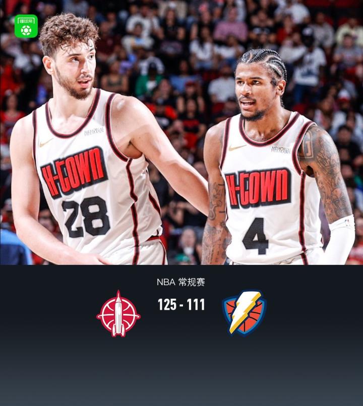 第四节,开节雷霆维金斯、霍姆格伦相继三分,火箭杰伦-格林站出来里突外投保持10分上下领先,随后雷霆杰伦威、亚历山大、哈腾三人相继得分,火箭多点开花依旧能回应维持两位数领先,最后2分多钟雷霆提前收兵换下主力,全场结束,火箭125-111战胜雷霆。