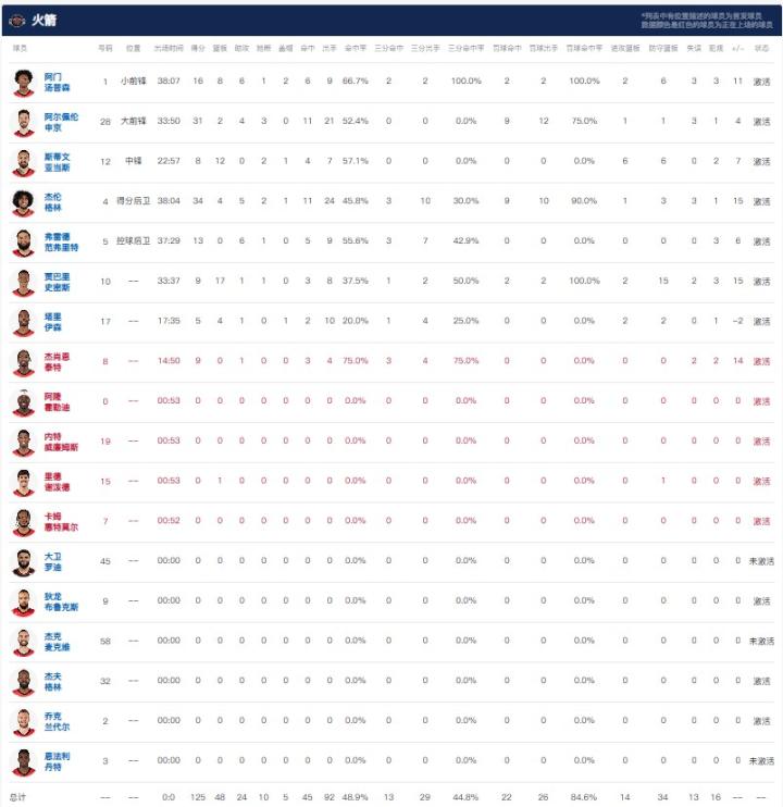 休斯顿火箭杰伦-格林34分4板5助2断1帽,申京31分2板4助3断,阿门-汤普森16分8板6助1断2帽;