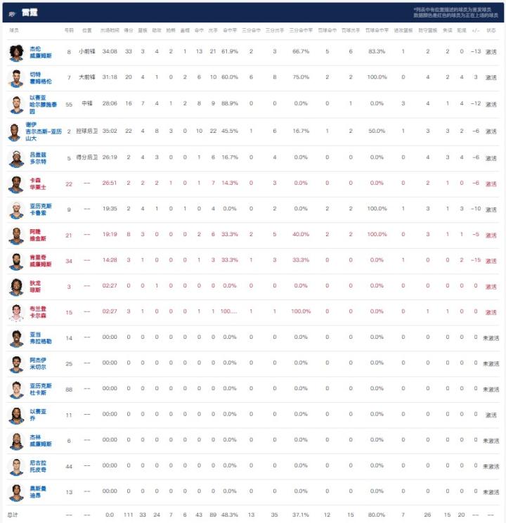 俄克拉荷马雷霆杰伦-威廉姆斯33分3板4助2断1帽,亚历山大22分4板8助3断,霍姆格伦20分4板1助2帽。