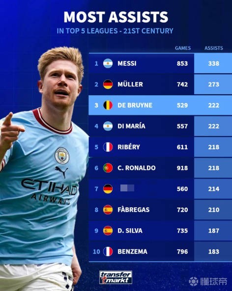 北京时间4月4日,德布劳内在社交媒体上发表动态,宣布自己将在赛季结束后离开曼城,随后,德国转会市场列出了21世纪五大联赛助攻排行榜。