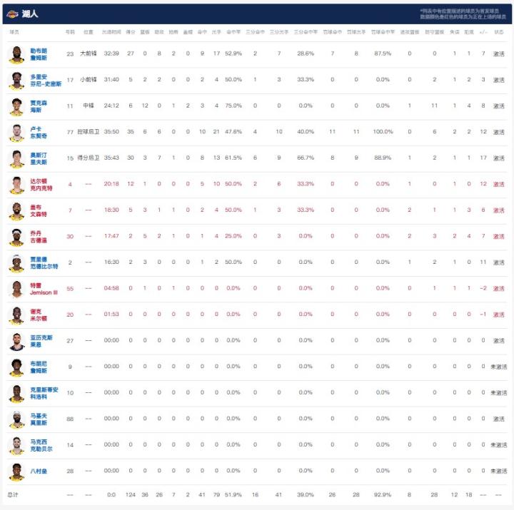 洛杉矶湖人东契奇35分6板6助,里夫斯30分3板7助1断,詹姆斯27分8助2断;