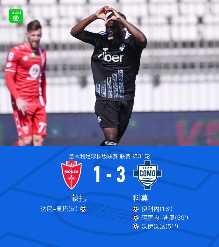 在北京时间4月5日进行的意大利足球顶级联赛第31轮比赛中,蒙扎主场迎战科莫。比赛开始后,达尼-莫塔为蒙扎首开纪录。随后,科莫展开反击,伊科内在阿萨内-迪奥的助攻下扳平比分,阿萨内-迪奥本人也取得进球帮助球队反超。此后,沃伊沃达再下一城锁定胜局。最终,蒙扎以1-3不敌科莫。