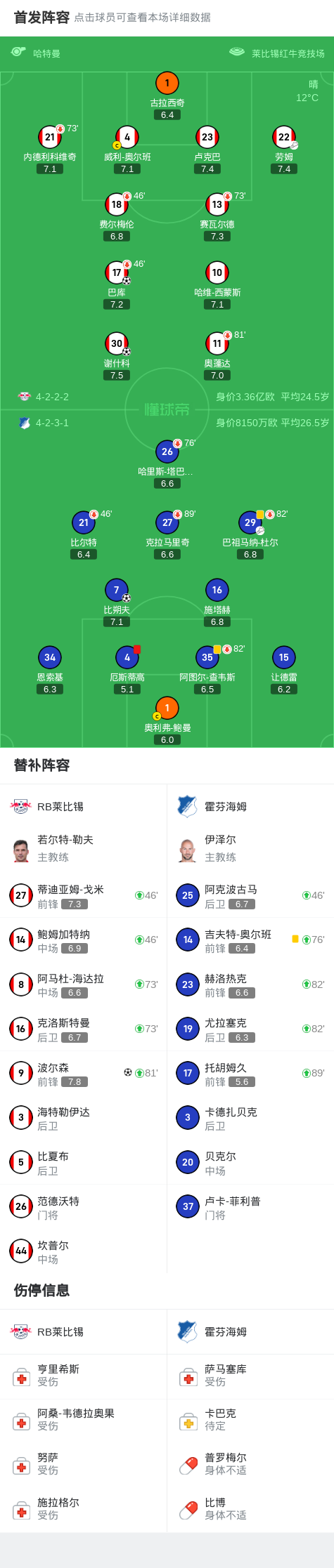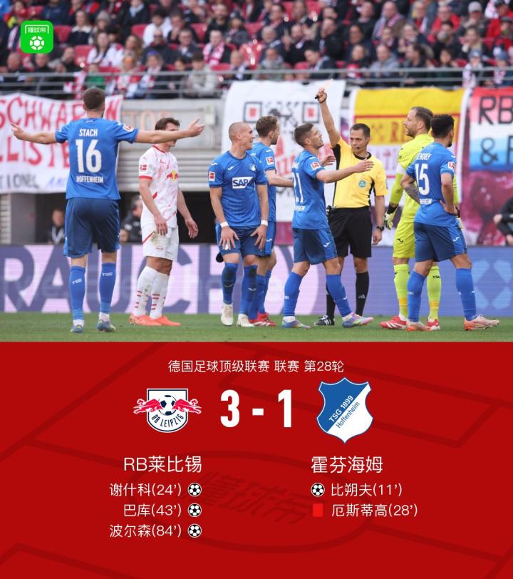 莱比锡3-1逆转十人霍芬海姆,谢什科、巴库、波尔森建功,厄斯蒂高染红