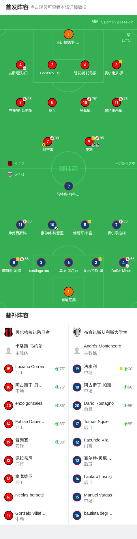 第35分钟,贝尔格拉诺防卫者球员古斯塔沃-门多萨助攻庞斯打入一球。