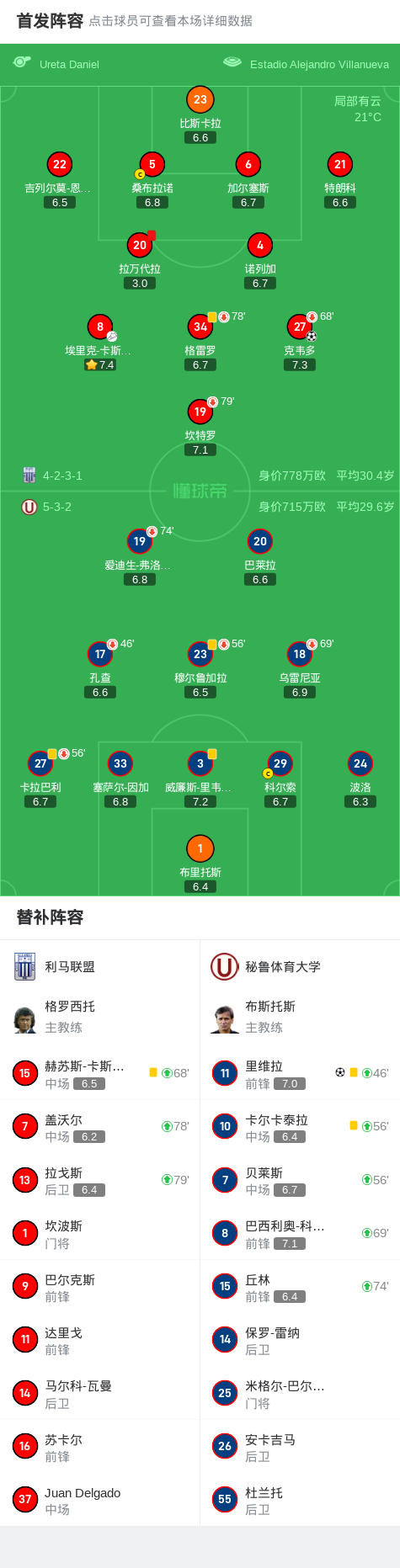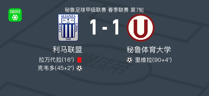 北京时间4月6日秘鲁足球甲级联赛 春季联赛 第7轮,利马联盟主场对阵秘鲁体育大学。利马联盟克韦多破门。秘鲁体育大学里维拉破门。最终比分利马联盟 1-1 秘鲁体育大学。