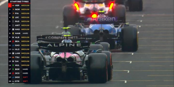 起步轮胎方面:大部分车手选择中性胎,汉密尔顿、博托莱托、奥康选择硬胎,而队尾的杜汉、斯特罗尔选择软胎;