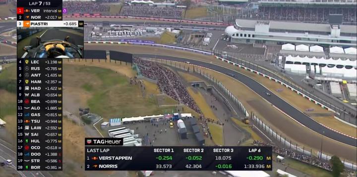 第7圈:诺里斯与维斯塔潘的差距已被扩大至2秒,皮亚斯特里进入队友的1秒范围之内;