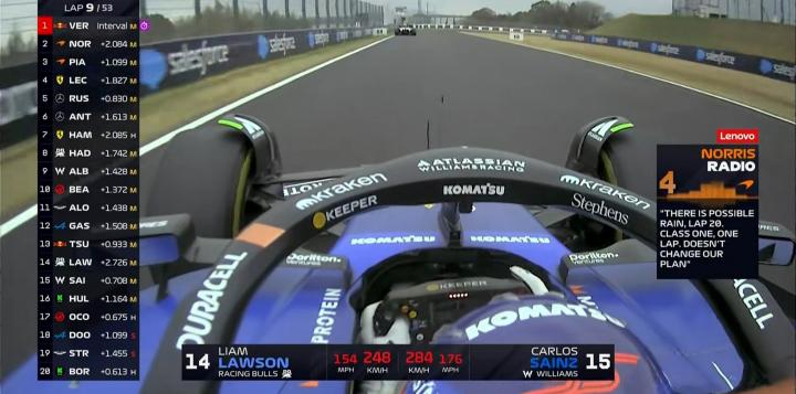 第9圈:诺里斯的工程师表示在第20圈会出现一些小雨,大概会持续1圈的时间;