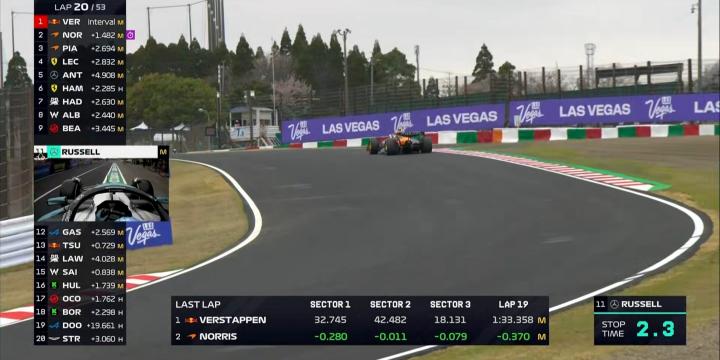 第20圈:拉塞尔率先选择进站一停,尝试undercut勒克莱尔;