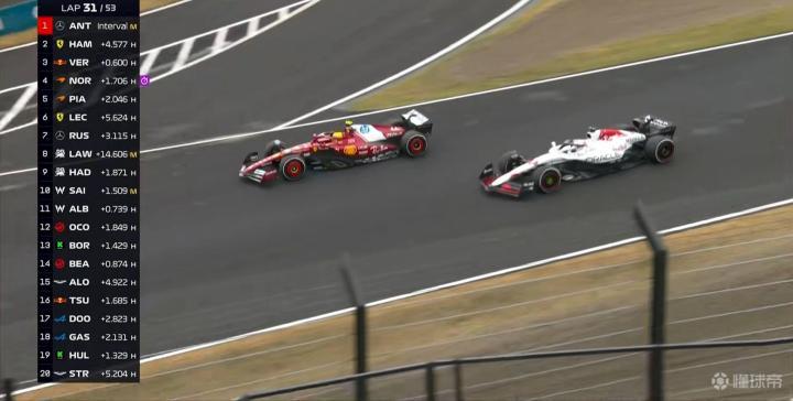 第30圈:哈贾尔在1号弯前抽头走外线强硬超越塞恩斯,上升到第9;