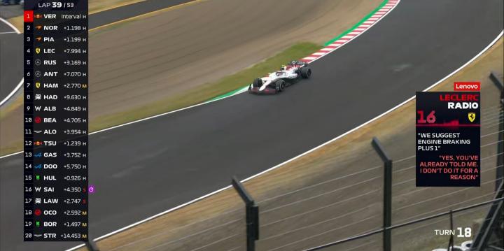 第39圈:法拉利又是无效沟通...不禁让人想起法拉利揭幕战的K1按钮...