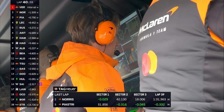 第40圈:皮亚斯特里已追进诺里斯的DRS范围,而诺里斯无法追近维斯塔潘!