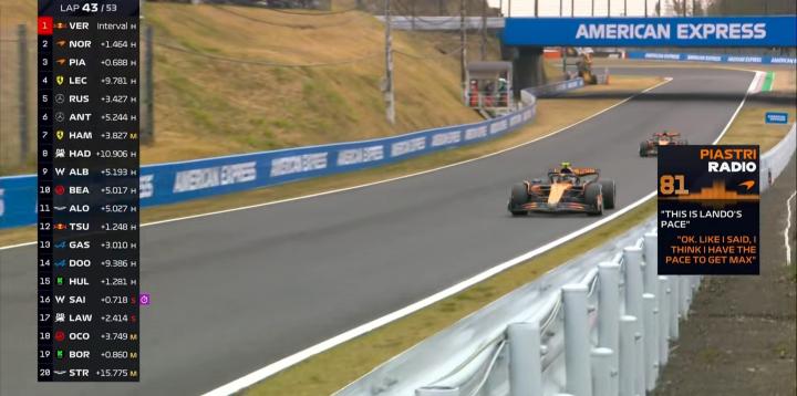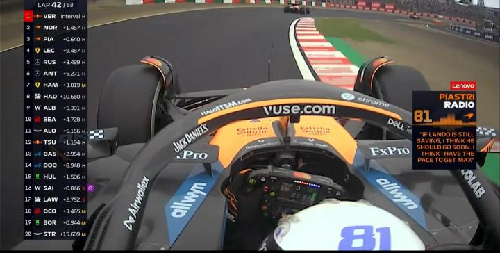 第42圈:皮亚斯特里表示诺里斯的跑法在保胎,他有更好的速度去追击维斯塔潘!