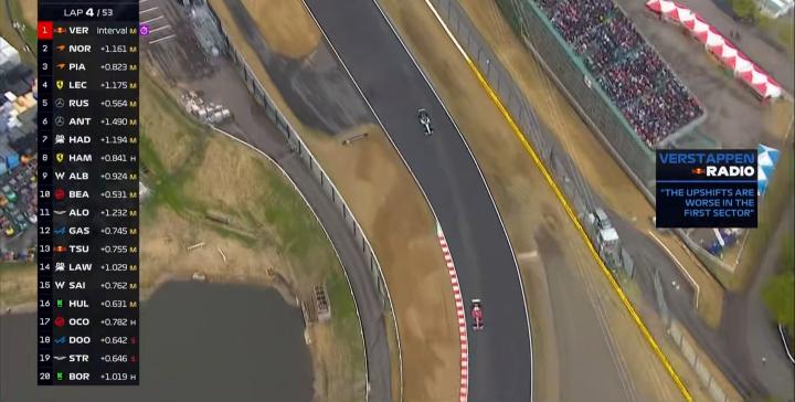第4圈:维斯塔潘表示自己的升档存在问题,但整体圈速还是不错的;