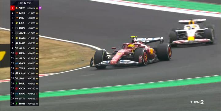 第6圈:汉密尔顿利用DRS在2号弯前轻松超越哈贾尔,上到第7名;