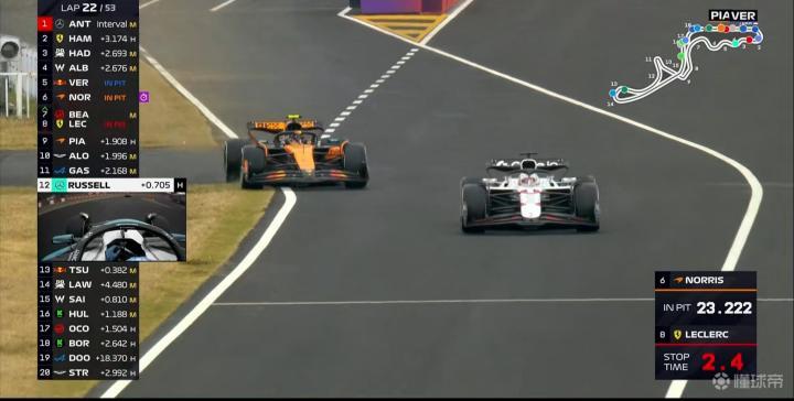 第22圈:迈凯伦的换胎(2.3秒)比红牛快了1秒,诺里斯尝试在维修区出口进行超越!