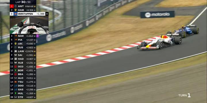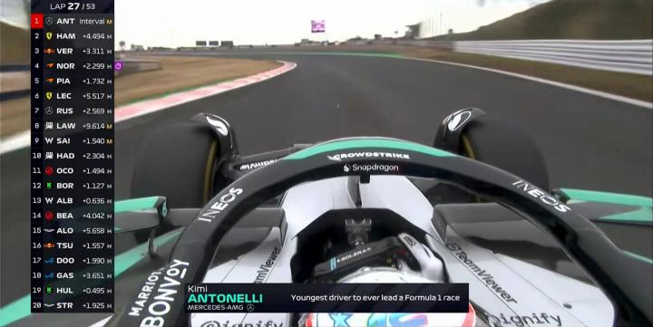 第27圈:安东内利超越维斯塔潘,成为F1历史上领跑比赛最年轻的车手!