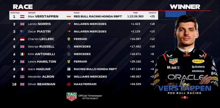 第1-第5:维斯塔潘、诺里斯、皮亚斯特里、勒克莱尔、拉塞尔