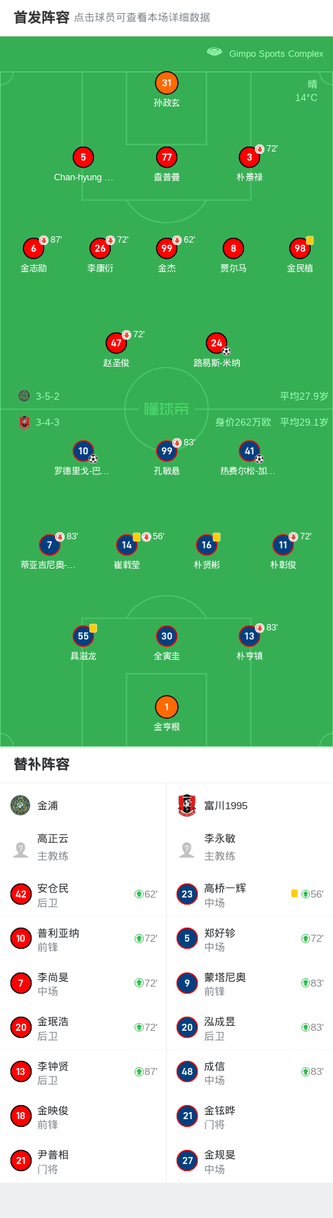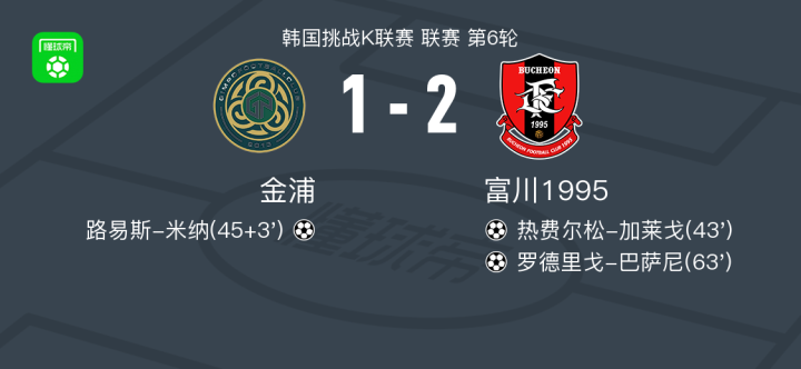 在北京时间4月6日进行的韩国挑战K联赛第6轮比赛中,金浦主场迎战富川1995。比赛中,富川1995由热费尔松-加莱戈率先取得进球,随后金浦依靠路易斯-米纳的破门扳平比分。不过,富川1995的罗德里戈-巴萨尼再度帮助球队取得领先。最终,金浦以1-2不敌富川1995。