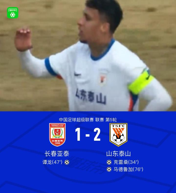 北京时间4月6日,中国足球超级联赛第5轮,长春亚泰主场迎战山东泰山。上半场克雷桑远射造险,王大雷神扑挡出贝里奇打门,贝里奇远射击中横梁,克雷桑头球破门,张华晨世界波被吹,下半场谭龙头球扳平比分,马德鲁加推射建功。最终,长春亚泰1-2不敌山东泰山。