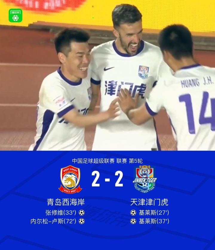 北京时间4月6日中国足球超级联赛 联赛 第5轮,青岛西海岸主场对阵天津津门虎。比赛中基莱斯调整低射远角破门率先拔得头筹,随后阿齐兹送出助攻,张修维门前铲射破门将比分扳平,然而基莱斯禁区抢点头球破门完成梅开二度帮助客队再次领先,比赛下半场阿齐兹又送出一记助攻,内尔松-卢斯破门再度拉平比分,随即全场战罢,最终比分青岛西海岸 2-2 天津津门虎。