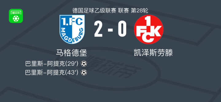 马格德堡2-0凯泽斯劳滕,巴里斯-阿提克独中两元
