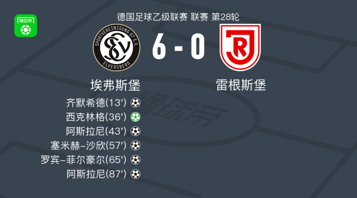 埃弗斯堡6-0横扫雷根斯堡,阿斯拉尼两球,西克林格点射