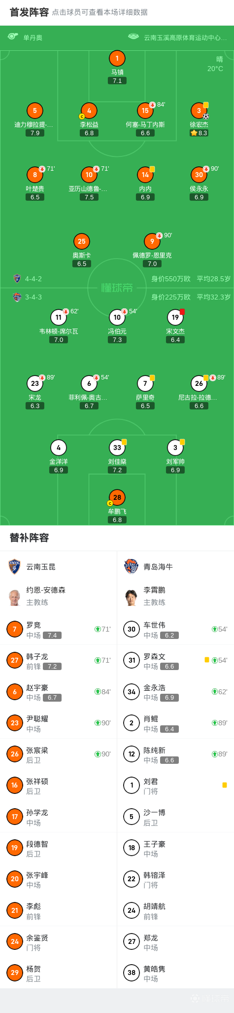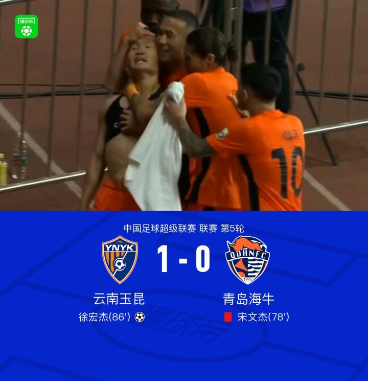 北京时间4月6日中国足球超级联赛 联赛 第5轮,云南玉昆主场对阵青岛海牛。宋文杰危险动作被红牌直接罚下。韩子龙助攻徐宏杰破门。最终,云南玉昆 1-0 青岛海牛取得队史中超主场首胜。